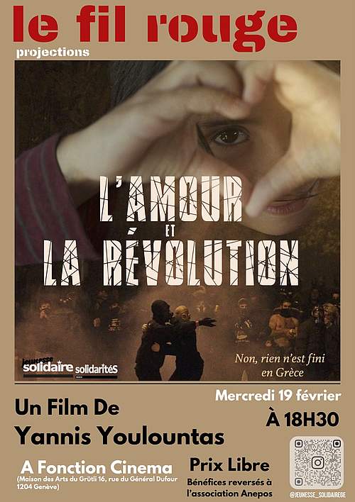Nous sommes le groupe jeune du mouvement politique SolidaritéS et dans le cadre de notre cycle de projection cinématographique nous projetons le film documentaire L’Amour Et La Révolution de Yannis Youlountas.